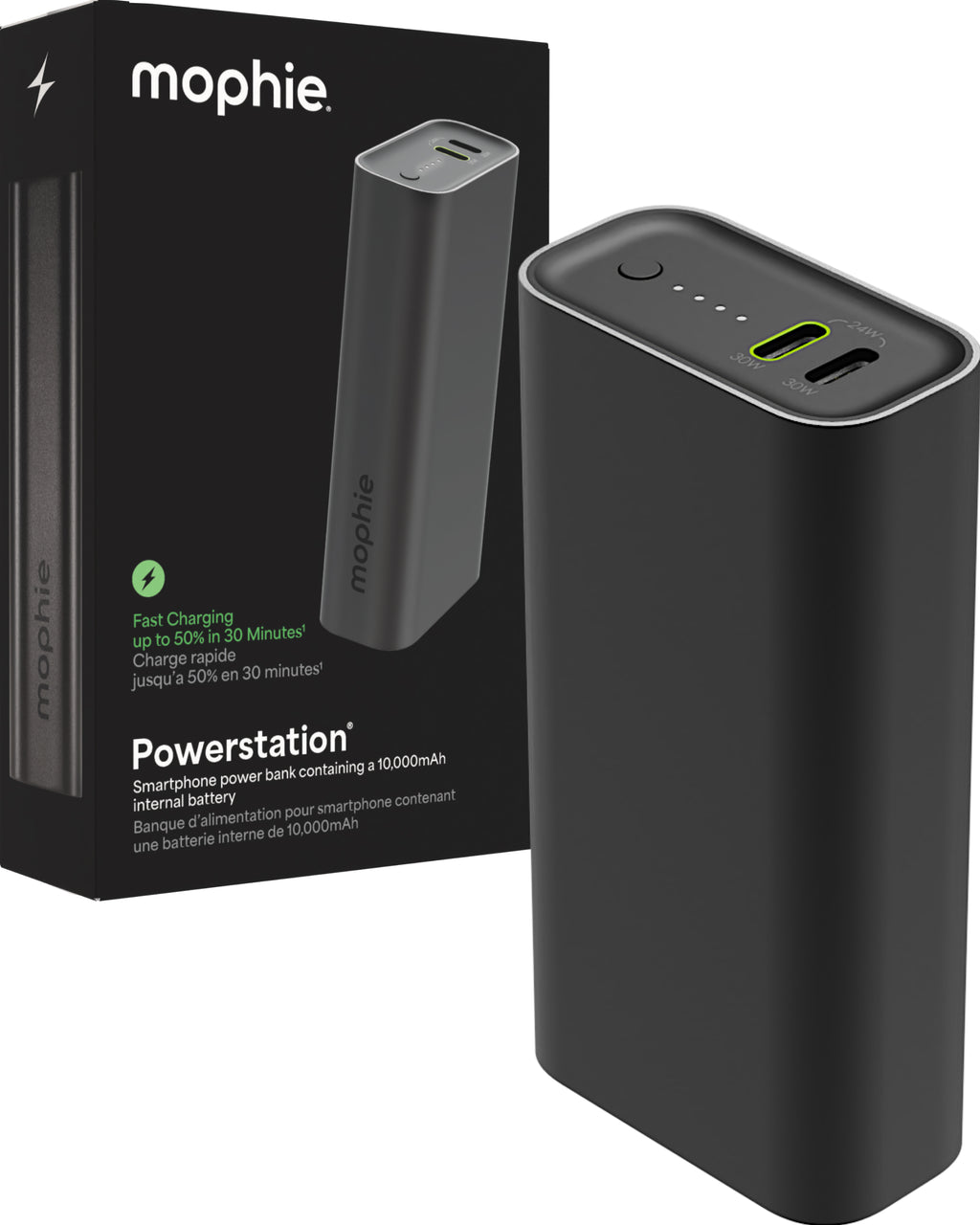 Con tu Powerstation mophie, nunca tendrás que quedarte sin batería. Su diseño compacto cabe fácilmente en tu bolso o bolsillo. Esta batería externa portátil ofrece carga ultrarrápida mediante USB-C con tecnología PD. Obtén hasta un 50 % de carga en solo 30 minutos.²