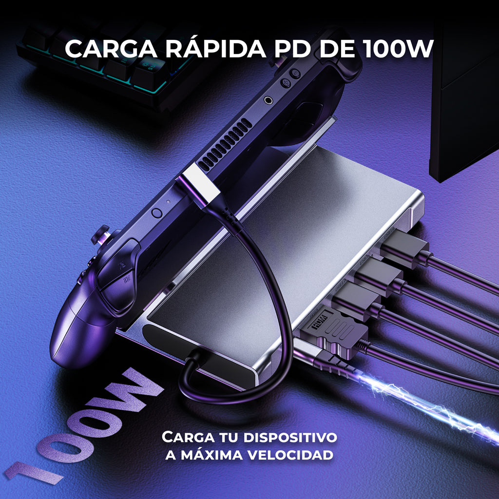 Equipado con un puerto USB-C compatible con la tecnología Power Delivery de hasta 100 W, este dock permite cargar la Steam Deck u otros dispositivos compatibles de manera rápida y eficiente, evitando interrupciones por falta de batería. Además, el HUB-M77 garantiza una carga estable y segura.